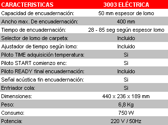 Tempo de encadernação 25-40 segundos dependendo da espessura da lombada. Sinal acústico e luz piloto para início e fim da encadernação.
